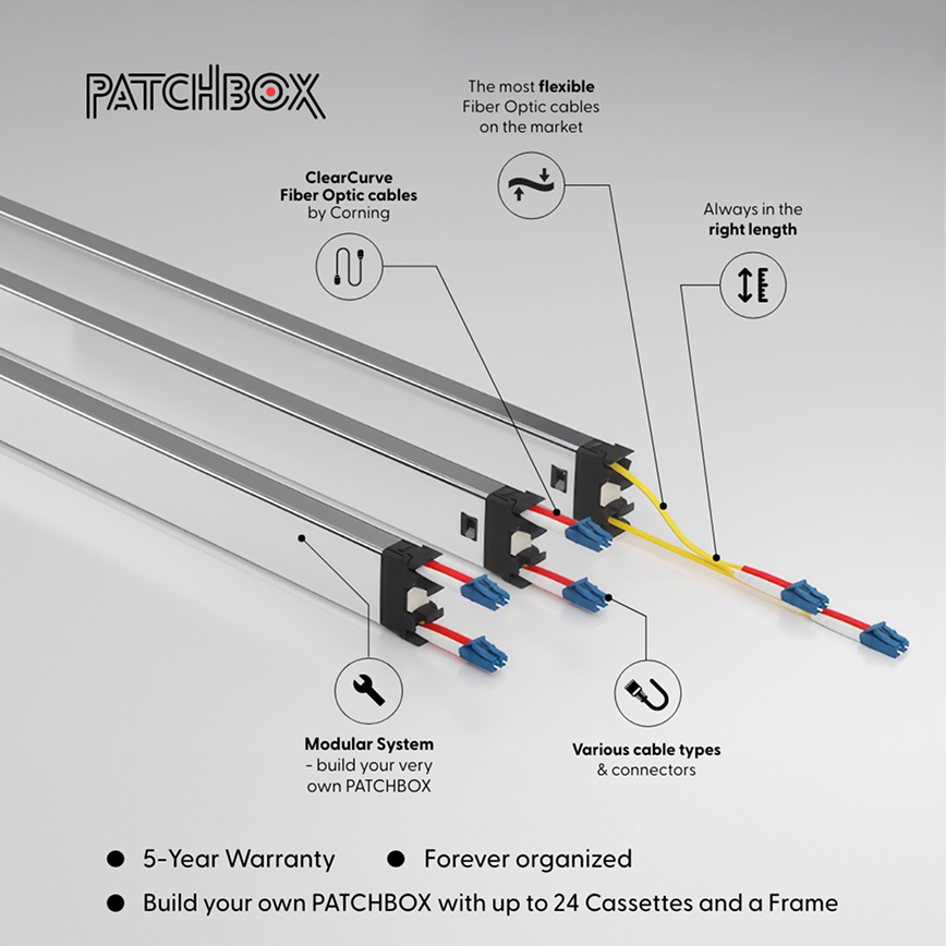 The patchbox.one with Fiber Optic cables is the ideal solution for a clean, efficient, and future-ready network rack. Equipped with ultra-flexible, retractable cables made from Corning® ClearCurve® Fiber, it delivers high performance while staying perfectly organized—no excess length, no mess.