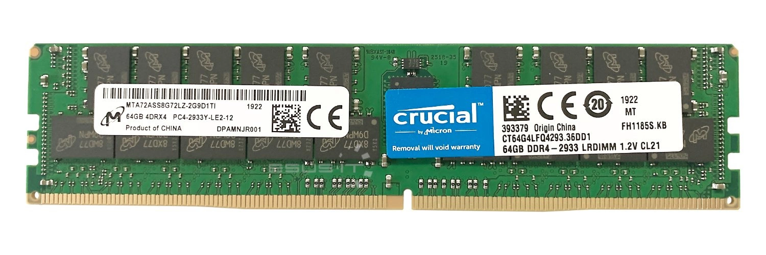 - Set of 64GB memory consisting of 1x 64GB 4Rx4 PC4-23400 DDR4 2933MHz 1.2 V ECC LOAD REDUCED DIMM | MTA72ASS8G72LZ-2G9